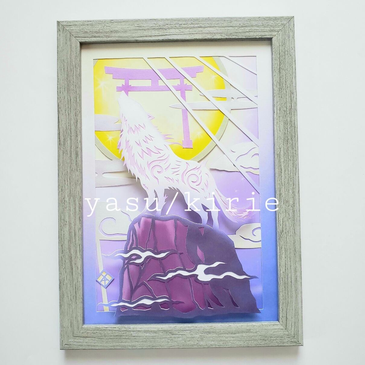 高次元の狼をモチーフにした切り絵作品です。メインのデザイン(狼)が背景より少し浮いた状態で制作しているのが特徴です。