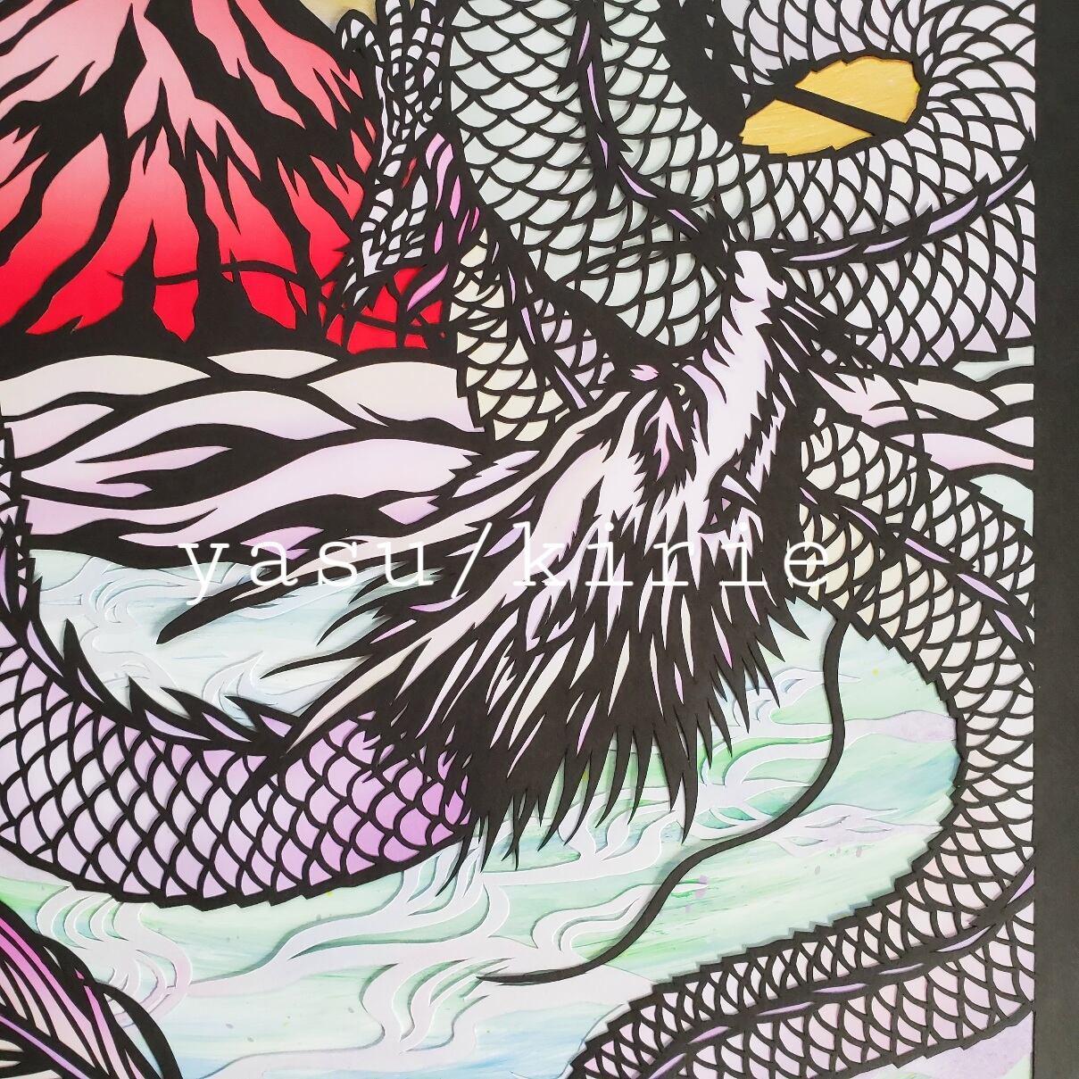 赤富士と龍神をモチーフにした切り絵作品です。背景の色付けはアクリル絵の具を使用しています。